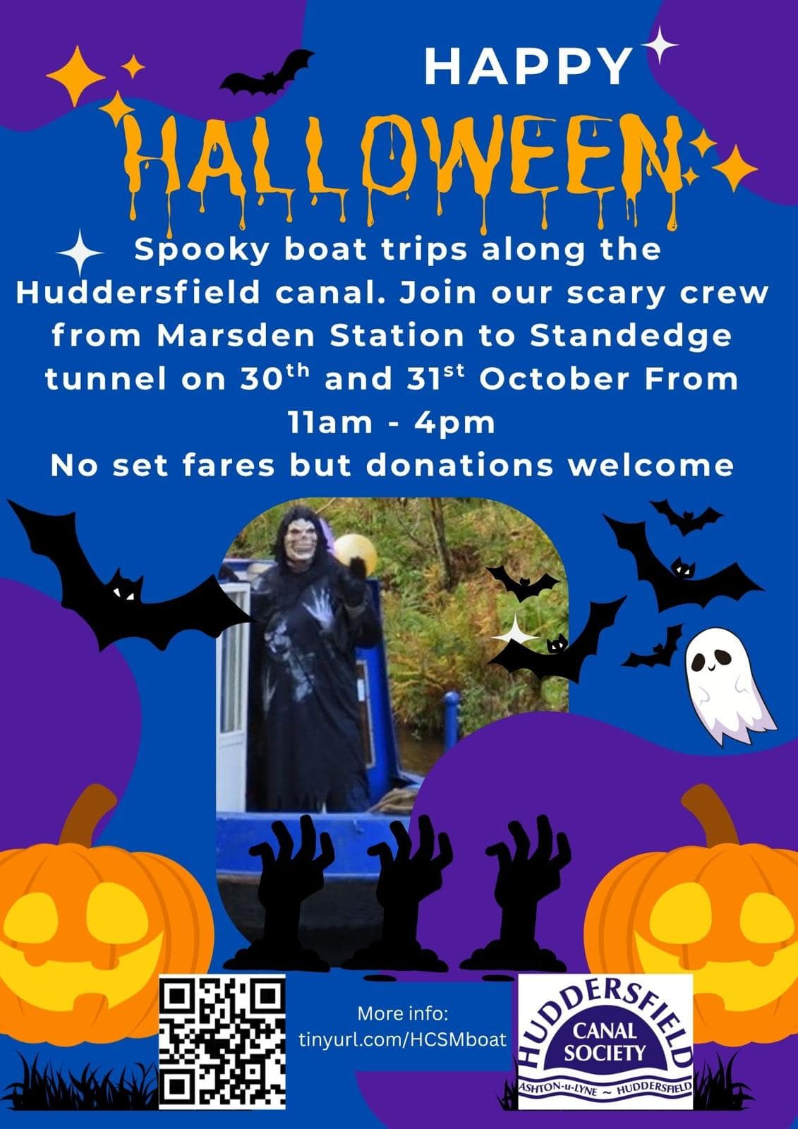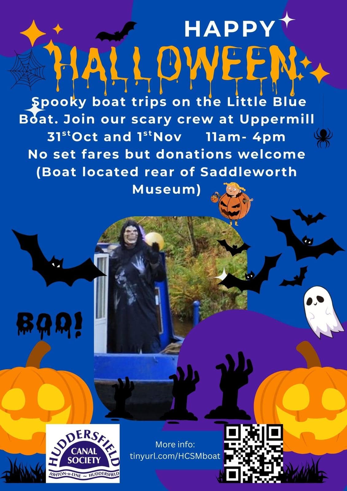 Spooky boat trips on the Little Blue Boat. Join our scary crew at Uppermill 31 Oct and 1 Nov 11am- 4pm st st No set fares but donations welcome (Boat located rear of Saddleworth Museum)