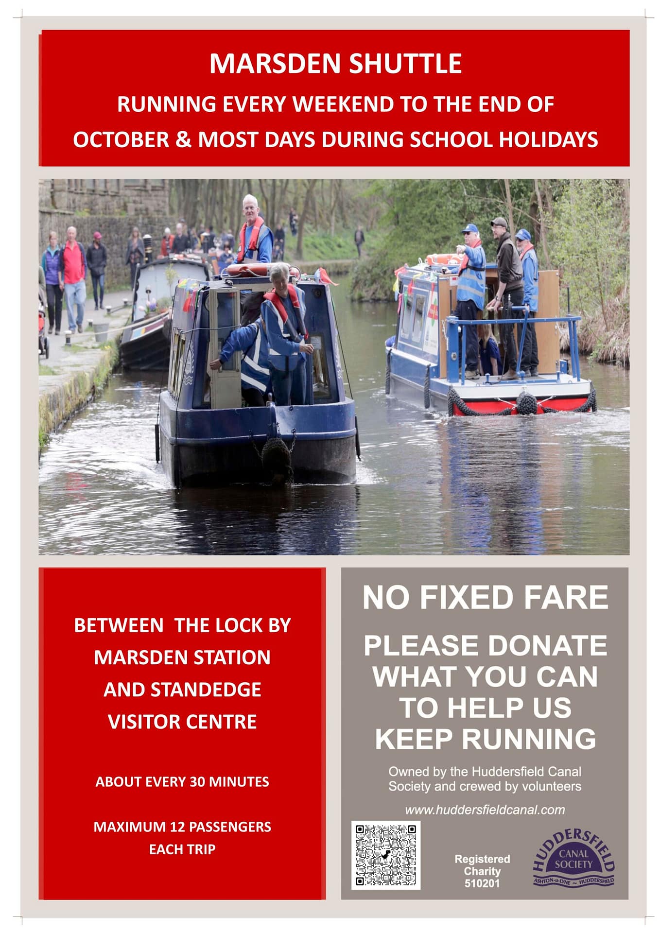 We run a regular shuttle service between the lock by Marsden Station and the Standedge Tunnel Visitor Centre. The trip lasts 12 to 15 minutes each way. No timetable, but we leave Marsden Station (Lock 42) or the Standedge Tunnel Visitor Centre around every 30 minutes.